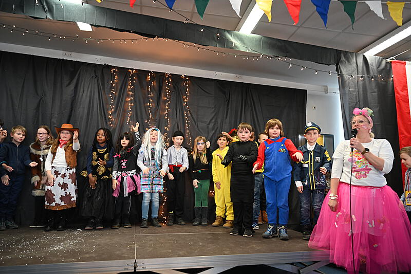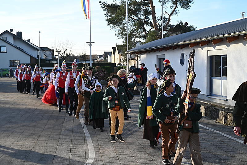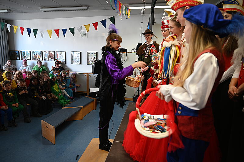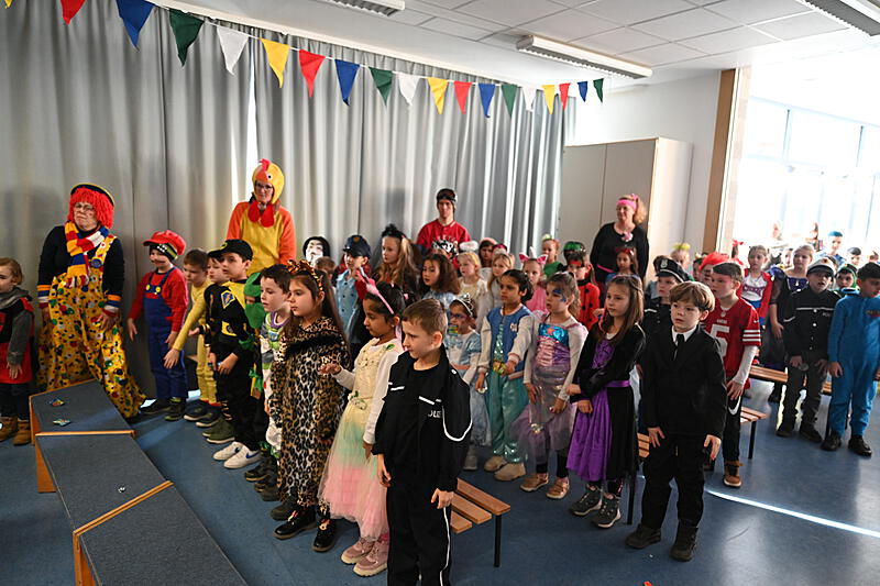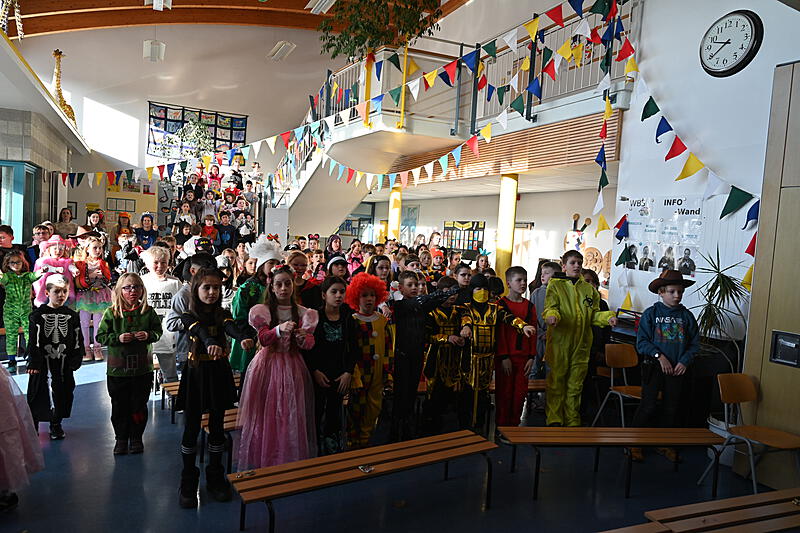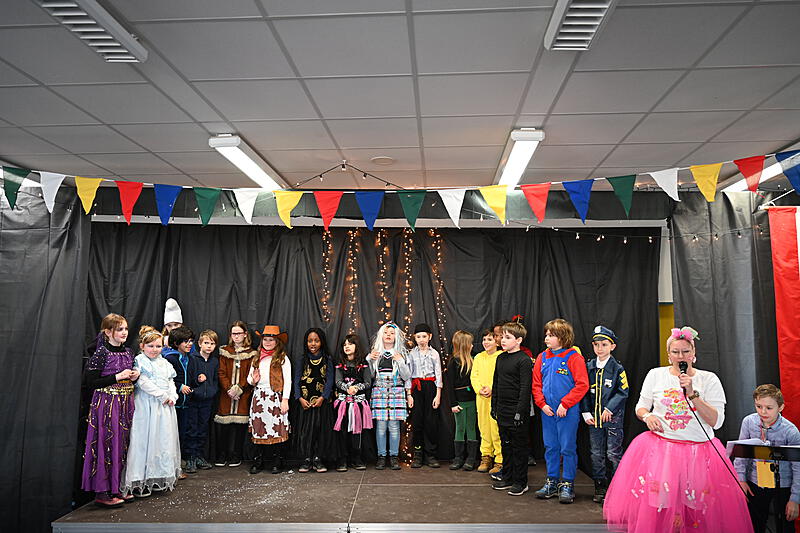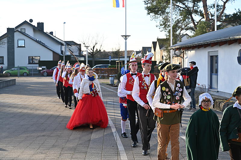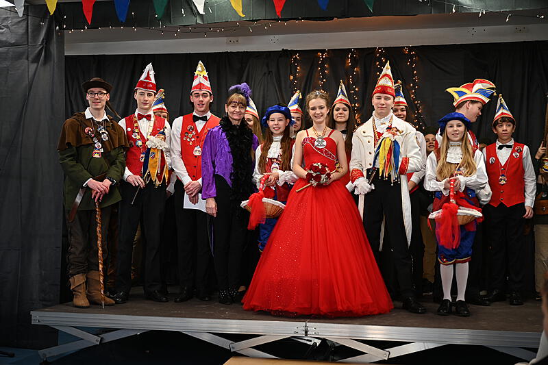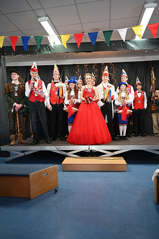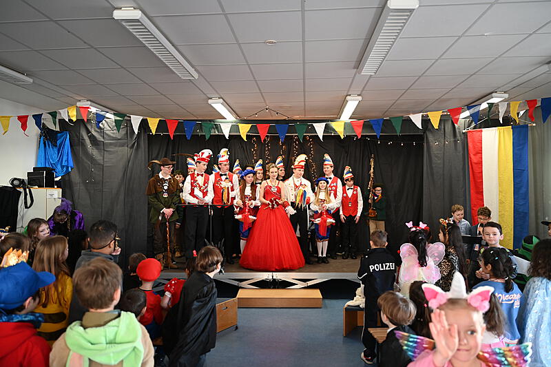 Fastnachtdienstag, am 13.02.2024, wurde in der Schule gefeiert mit dem Besuch des Jugendprinzenpaars und Hofstaat: