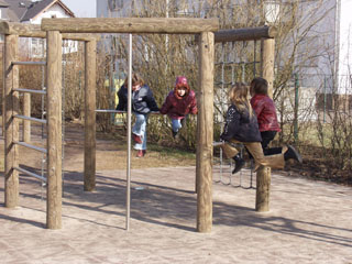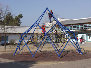 Das frei stehende Turnhallengebäude wird auch außerhalb der Unterrichtszeiten von Vereinen genutzt. Diese 3 Gebäudeteile, mit ihrer u-förmigen Anordnung, begrenzen den weitläufigen Pausenhof. Der größere Bereich ist gepflastert und mit Spielfeldern bemalt. Der Schulhof ist mit einem Pyramidenhügel, Fahrradständern, einer Tischtennisplatte und zum Teil begrünten Pergolagängen mit Bänken ausgestattet. Seit 2001 gibt es eine neue Attraktion: unsere Kletterpyramide.