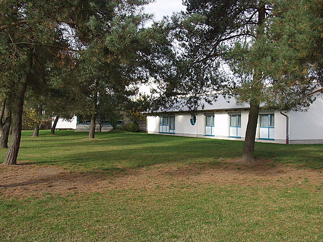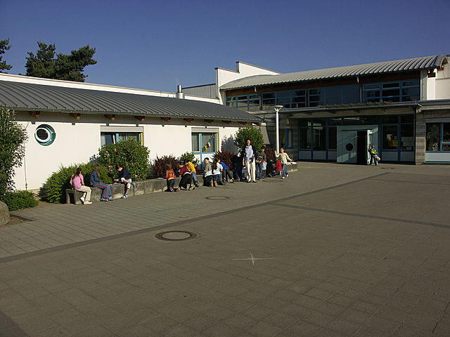 Die Verbindung zu dem 2. Bauteil ist unser sogenanntes "Aquarium", das für Elterngespräche und für kleine Gruppenarbeiten genutzt wird. Eine großzügige Eingangshalle führt in den zweigeschossigen Querbau. Hier befinden sich im Erdgeschoss die Räume der Vorklasse und 6 Klassenräume. Gegenüber den Unterrichtsräumen liegen die Funktionsräume wie Toiletten, die Hausmeisterwerkstatt, die Schüler- und Betreuungsküche, der Mehrzweckraum und die beiden Räume für den Werkunterricht. Im 1. Obergeschoss liegen weitere 7 Klassenzimmer, sowie entsprechende sanitäre Anlagen.Das Gebäude ist durch Brandschutztüren in mehrere Bereiche getrennt. Der östlich abzutrennende Teil dient am Nachmittag der Musikschule als Übungsräume.